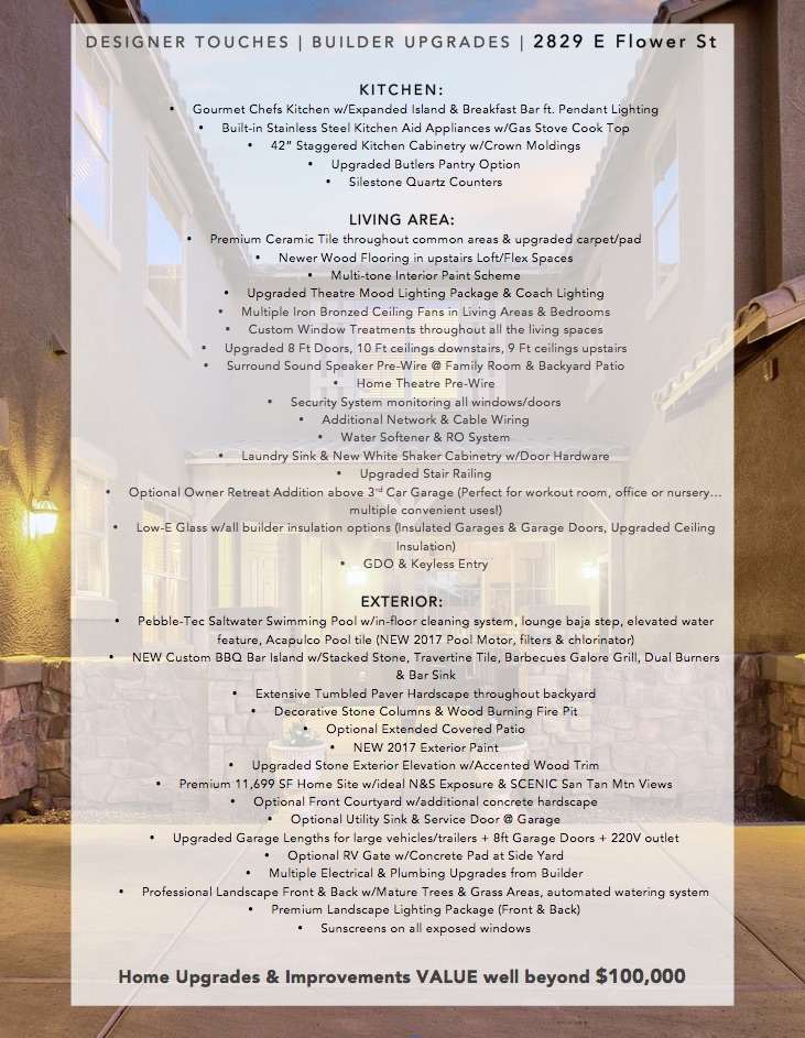 the location, destination master plan community, impressive San Tan Mountain views, top-rated Chandler School options, hot new booming developments/amenities, designer home interior w/luxury finishes & owner improvements valuing well over $100,000, pristine original owner upkeep, distinctive 2×6 craftsmanship, upgraded home efficiencies & securities, today’s transitional floor plan w/an open great room concept modeling towering 10ft ceilings, expansive home spaces & a generous penthouse owner suite, tasteful gourmet kitchen layout that would please a true Chef & finally a Backyard Pool Oasis for all the summers days & nights you’ve earned to relax & entertain in your breathtaking outdoor living space! Consider this the ONE!