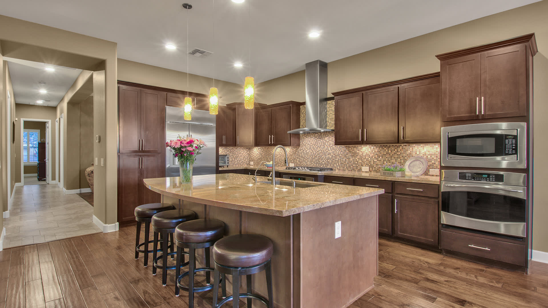 Step outside to the oversized travertine patio & professionally designed backyard featuring a heated pebble tech swimming pool complete with therapeutic jets, elevated water features, and energy-efficient pool equipment. Other outdoor features include a large grassy play area, specialty lighting, and a built-in BBQ all surrounded by lush tropical landscaping.