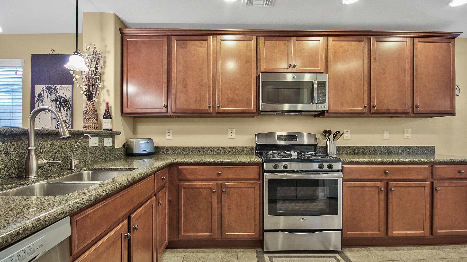 Interior upgrades include stainless steel kitchen appliances with gas range, upgraded maple wood kitchen cabinetry, cabinet door hardware, granite counters, reverse osmosis & water softening systems, two-tone interior paint scheme, recessed theatre lighting/ceiling fans, upgraded window coverings, upgraded door hardware, larger baseboards, ceramic 20″ tile in all common areas including great room & like new premium carpet. There’s more… build sheet available upon request.