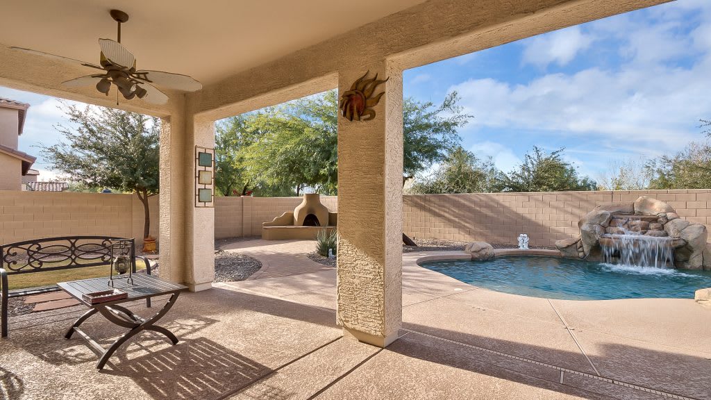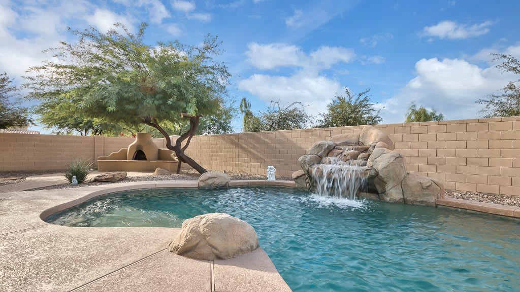 Step Outside to Your Very Own Resort Style Backyard… Includes a Sparkling Pebble Tec Pool w/ Grotto-Style Water Feature, Extended Paver Patio & Custom Fireplace…Perfect for your Arizona Fall & Winter Evenings, Grassy Area for Kids & Green Tropical Landscaping. The 9,500 SqFt prime interior home site provides ample space between both neighboring rooflines, creating extended privacy.