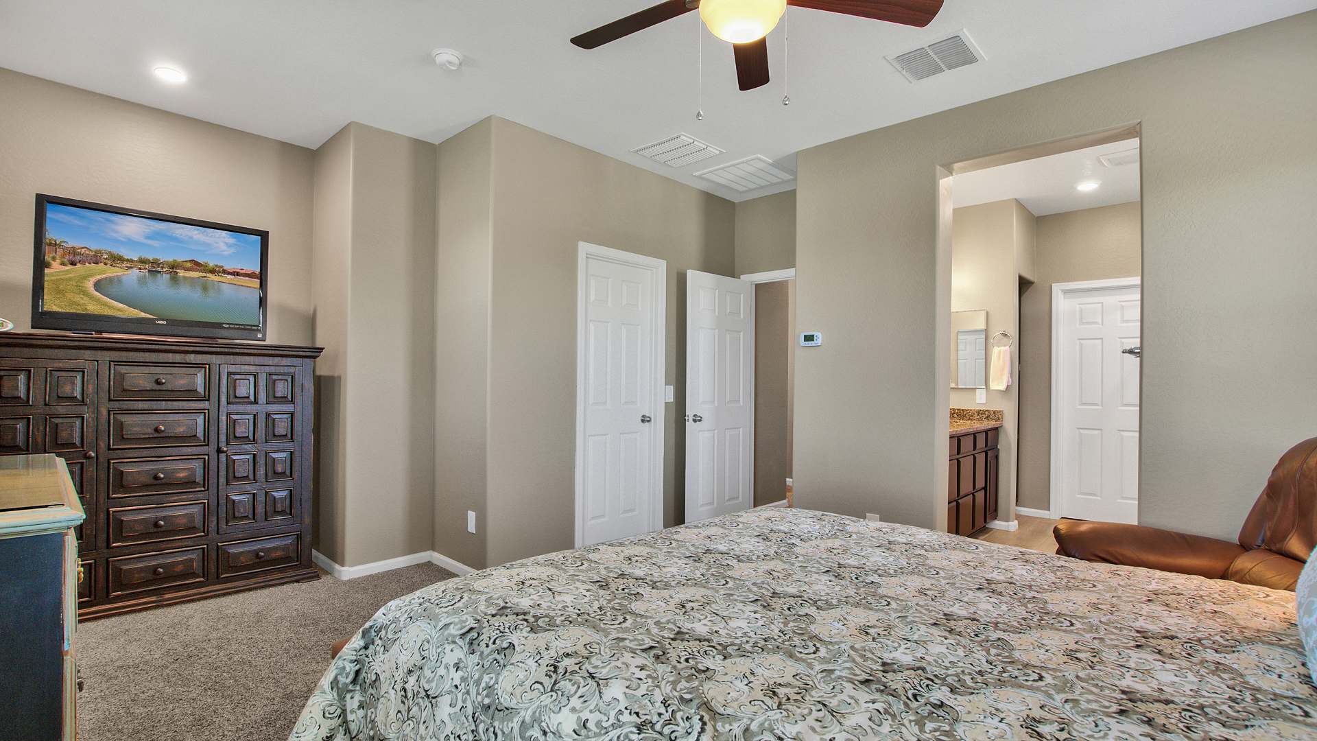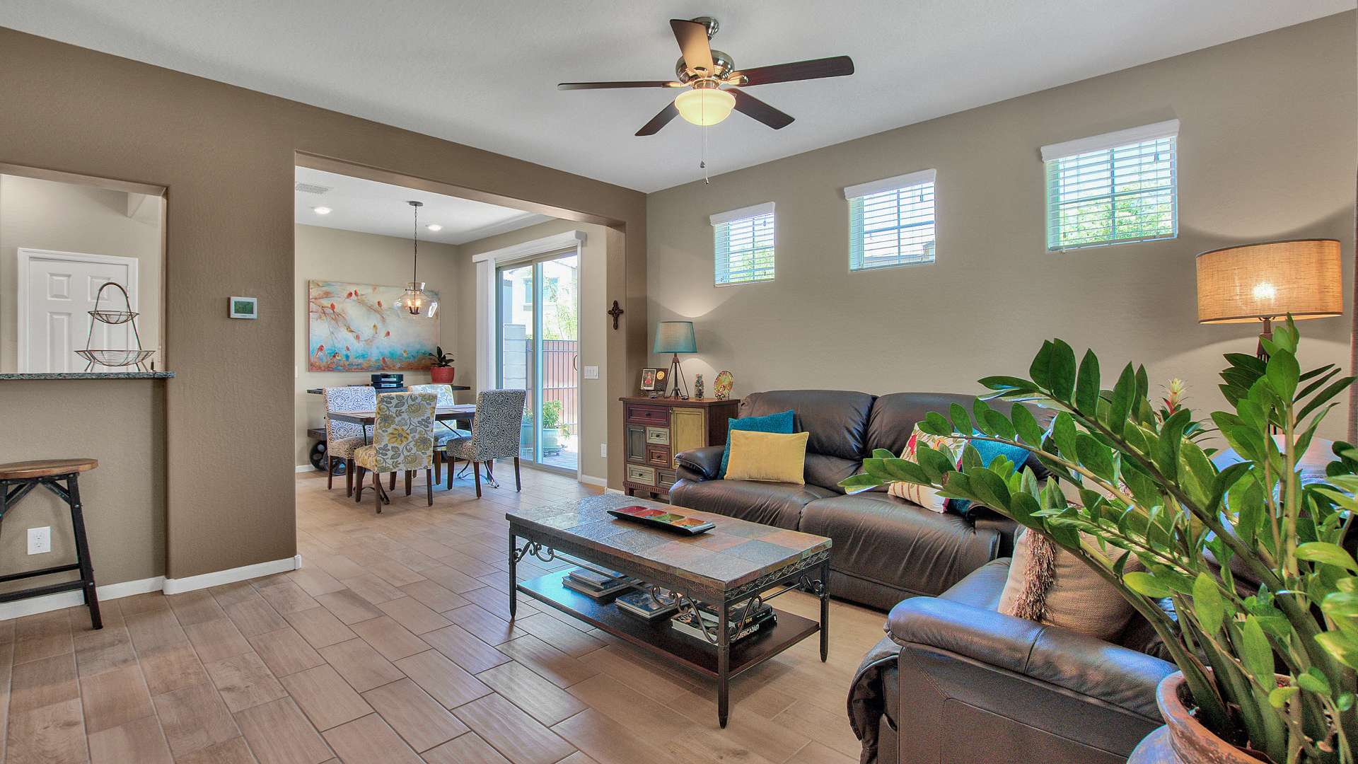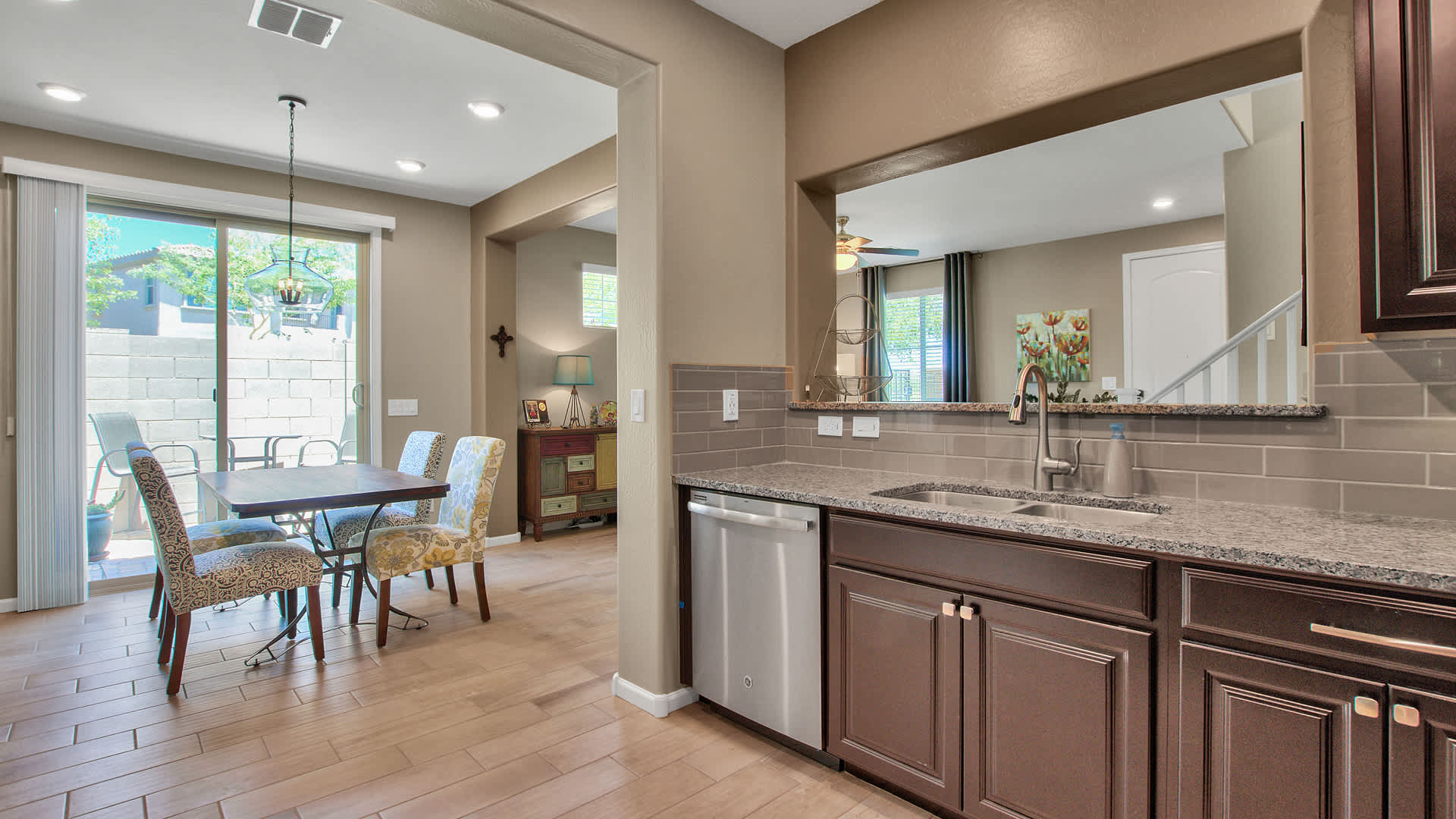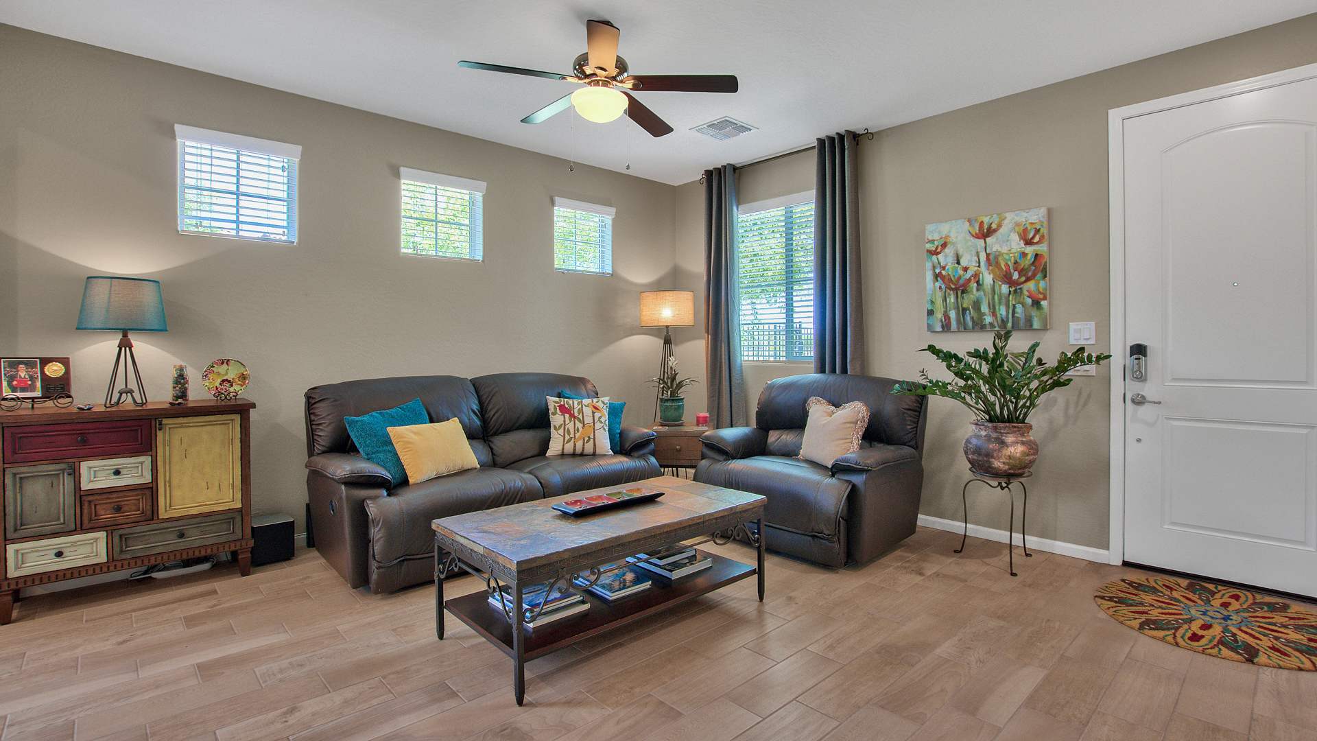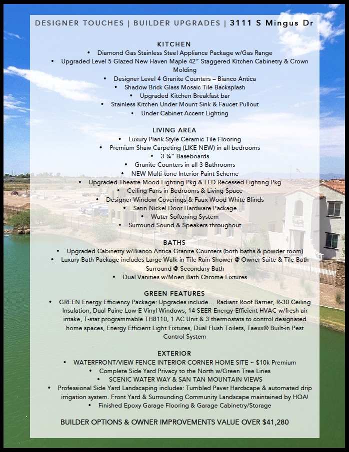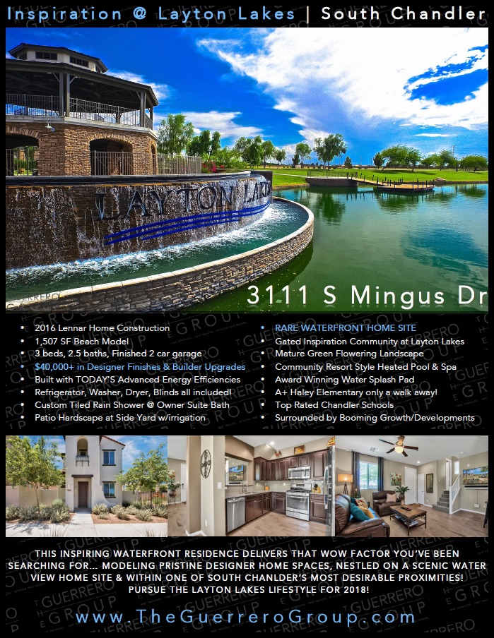 Inspiration at Layton Lakes is sold out! Here is your opportunity to own a NEAR NEW 3 Bedroom, 2.5 Bath Waterfront Home in this Exclusive Gated Community for under $300,000 in South Chandler! This beautifully designed home features every builder upgrade available, including Luxury Plank Style flooring, Gourmet Kitchen Package with Stainless Steel Appliances, Group 4 Granite Counter Tops and 42” Custom New Haven Maple Cabinetry. Owner upgrades include designer glass tile kitchen backsplash, professionally installed epoxy coated garage floor, ceiling fans in every room, and paver patio with flowering landscape. All furnishings, flat-screen TV’s, appliances, patio furniture, garage storage and flatware are available to purchase with separate bill of sale.