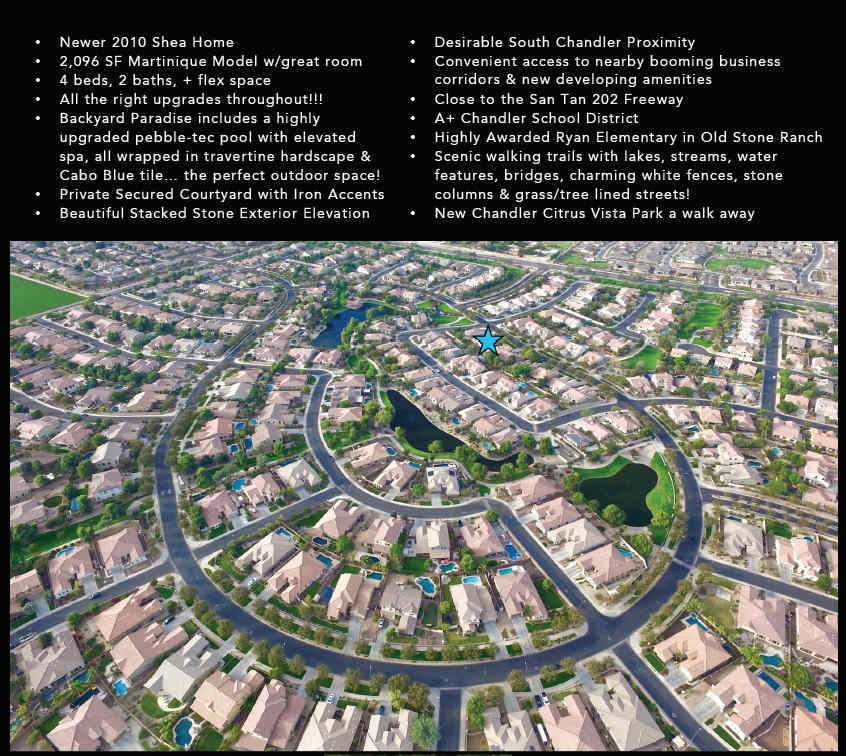 is the jewel of Old Stone Ranch! This Stunning 2010 Shea Residence portrays picture-perfect living in every way…. rare high-end finishes, exotic stacked stone elevation with iron accents & private courtyard, a paradise backyard space with designer pebble-tec pool & elevated spa, today’s highly functional great room floor plan, located in scenic water & tree lined destination master plan, A+ Chandler Schools & the Award Winning Ryan Elementary within the community, close to all the new booming developments & business corridors, and all offered at an impressive price point under $400,000.