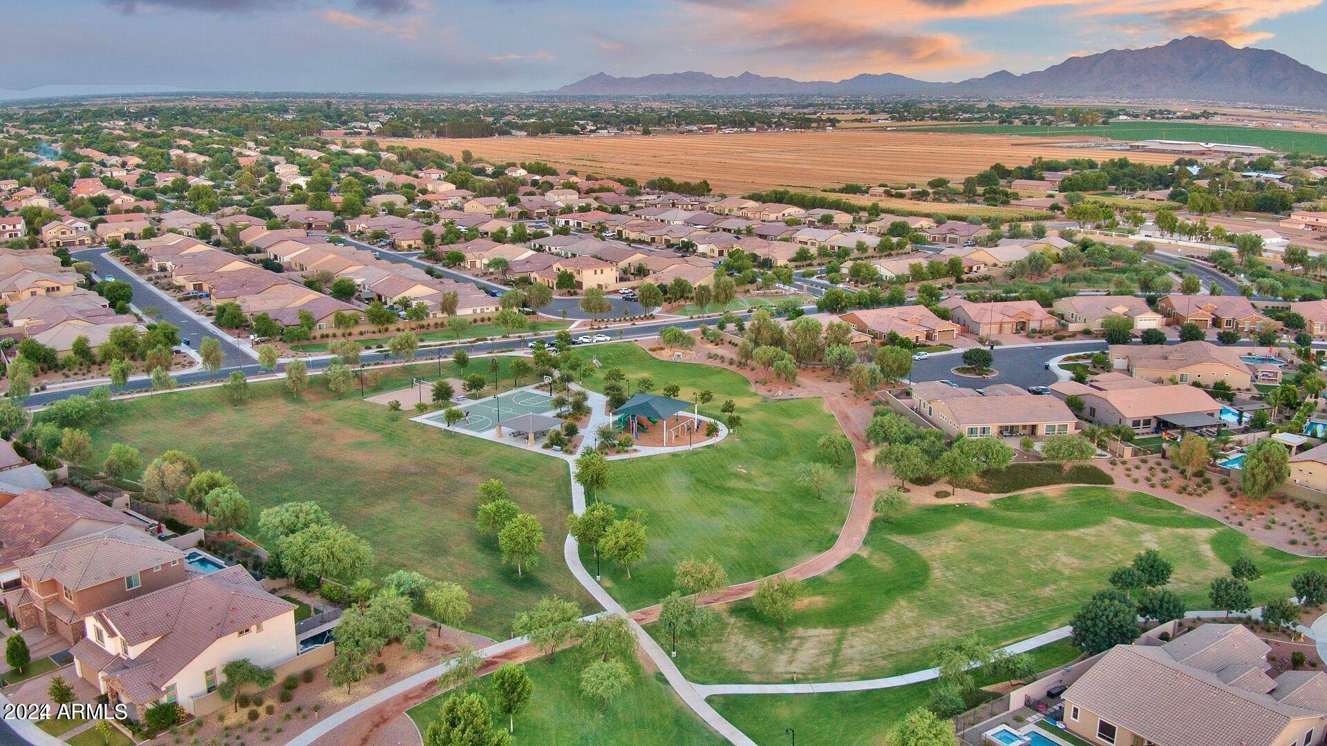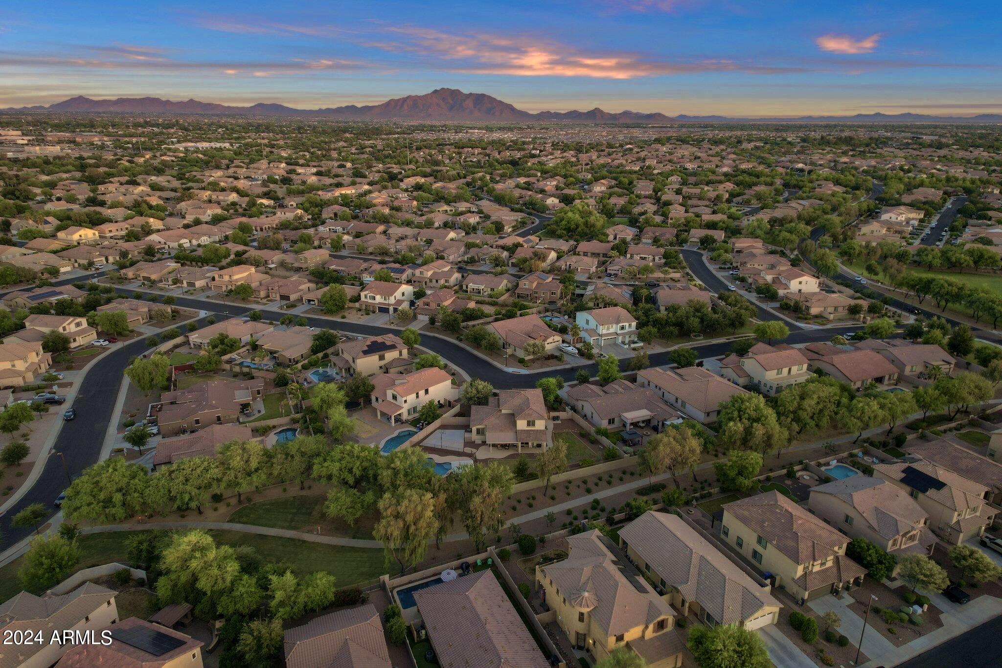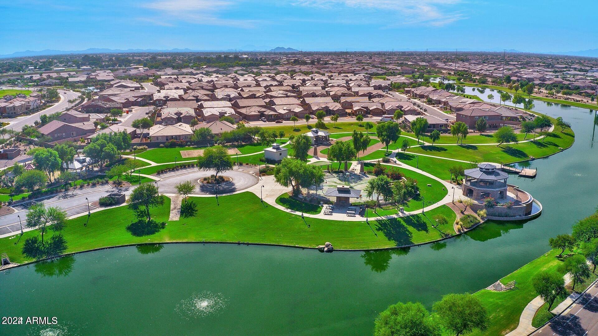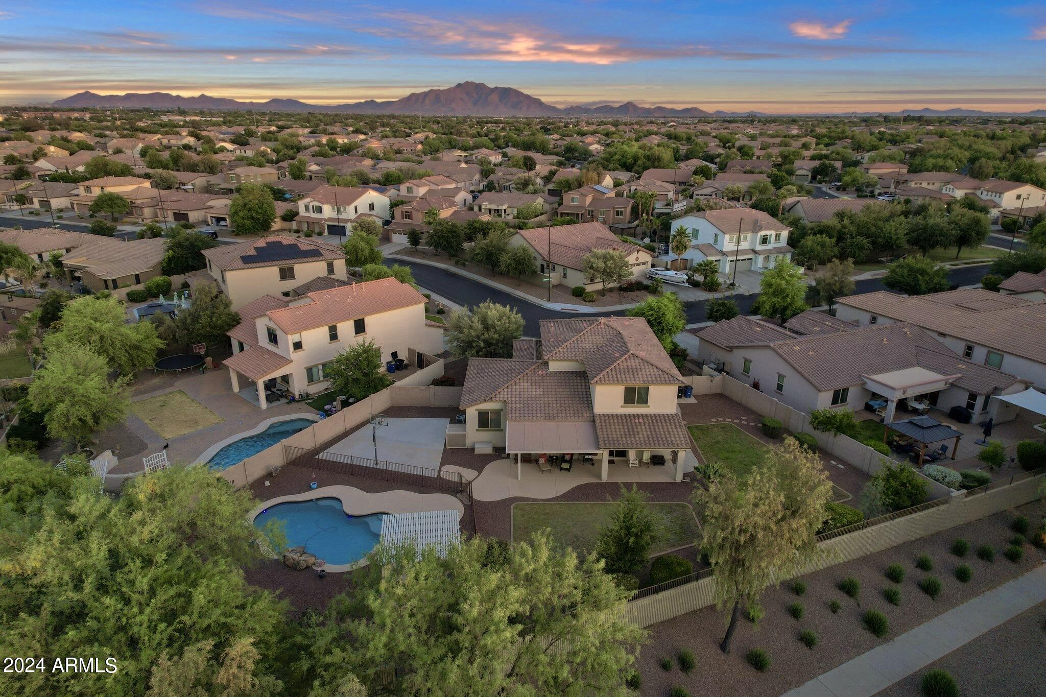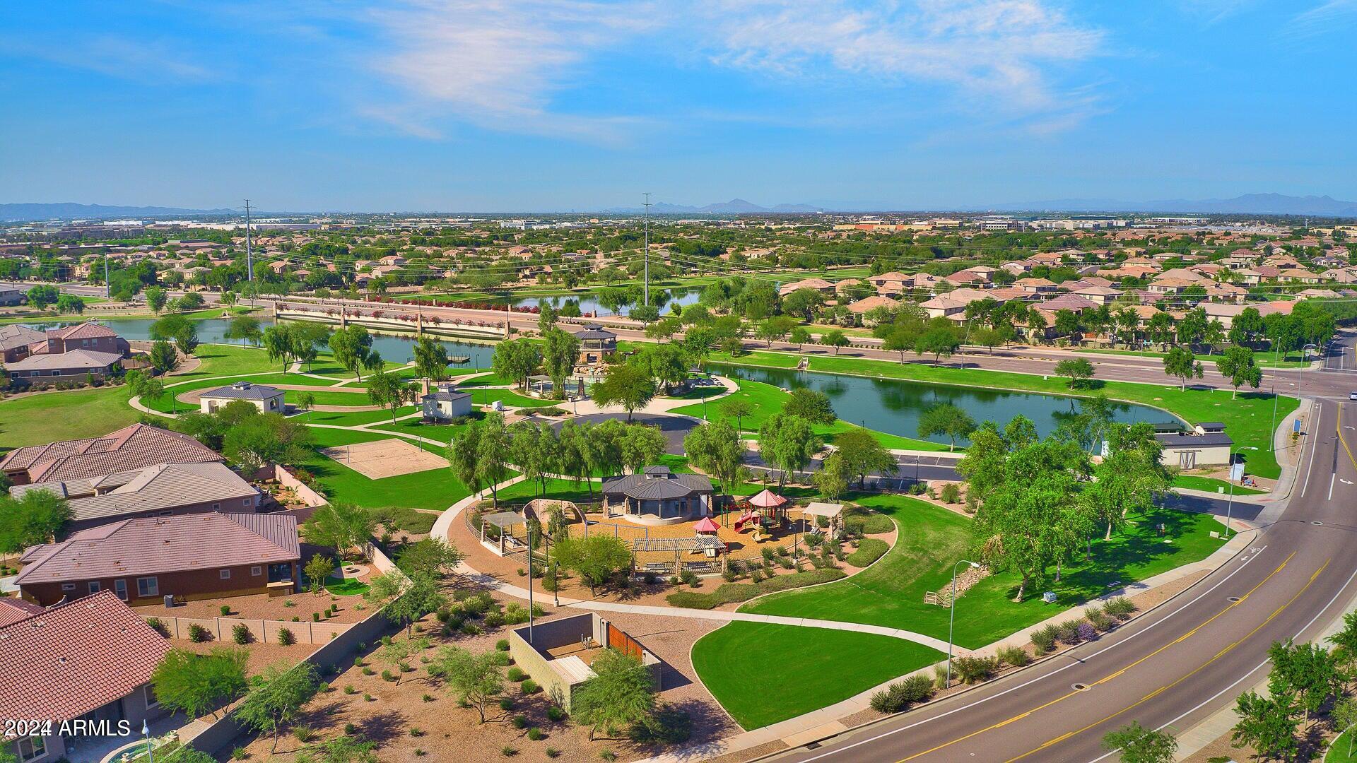 Rare Opportunity to Live in South Gilbert's Destination Master Plan Community of Layton Lakes! This new market offering portrays picture perfect living in every way. Imagine Living in this Lovely Ranch Inspired Family Home Displaying Craftsmanship, Designer Home Interior with Luxury Finishes & Countless Upgrades, Today's Open Floor Plan w/ expansive Home Spaces & Generous Owner's suite w/Spa-Style Bath. Fully Landscaped Premium Interior Lot over 1/3 acre that borders a Beautiful Greenbelt. Enjoy the summer days & nights in your outdoor escape featuring Mature Arcadian Green Landscape w/Flowering Plants & Trees, Sparkling PebbleTec Swimming Pool, Sports Court, Large Grassy Play Areas & expanded patio space w/ Pergola perfect for outdoor furniture & fire pit. THIS IS THE ONE! For more than a decade, Layton Lakes has been the destination community known for its picturesque scenery and neighborhood charm. It's warm and inviting, full of friendly neighbors, engaging lifestyle, and exceptional educational opportunities. Featuring several tree-lined parks, playgrounds, tennis, basketball and volleyball courts, soccer and baseball fields, lakes, streams, waterfalls, and splash pad all surrounded by scenic water lined walking trails. Nestled between both the thriving City of Chandler & Town of Gilbert, residents take advantage of the countless nearby amenities including the 101 & San Tan 202 freeways, shopping, dining, entertainment, airports, hospitals, booming business corridors, and new Southeast Valley Developments.