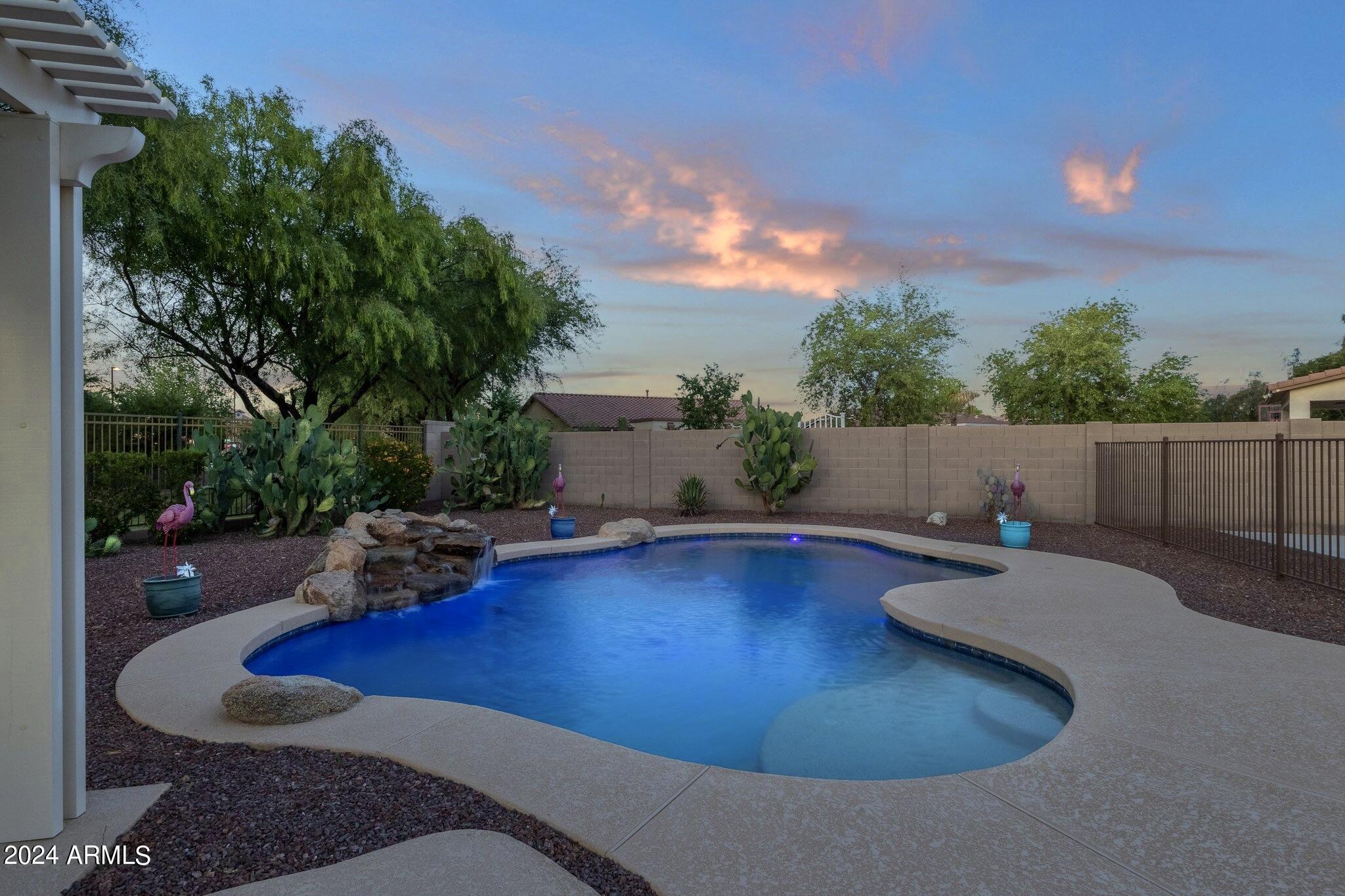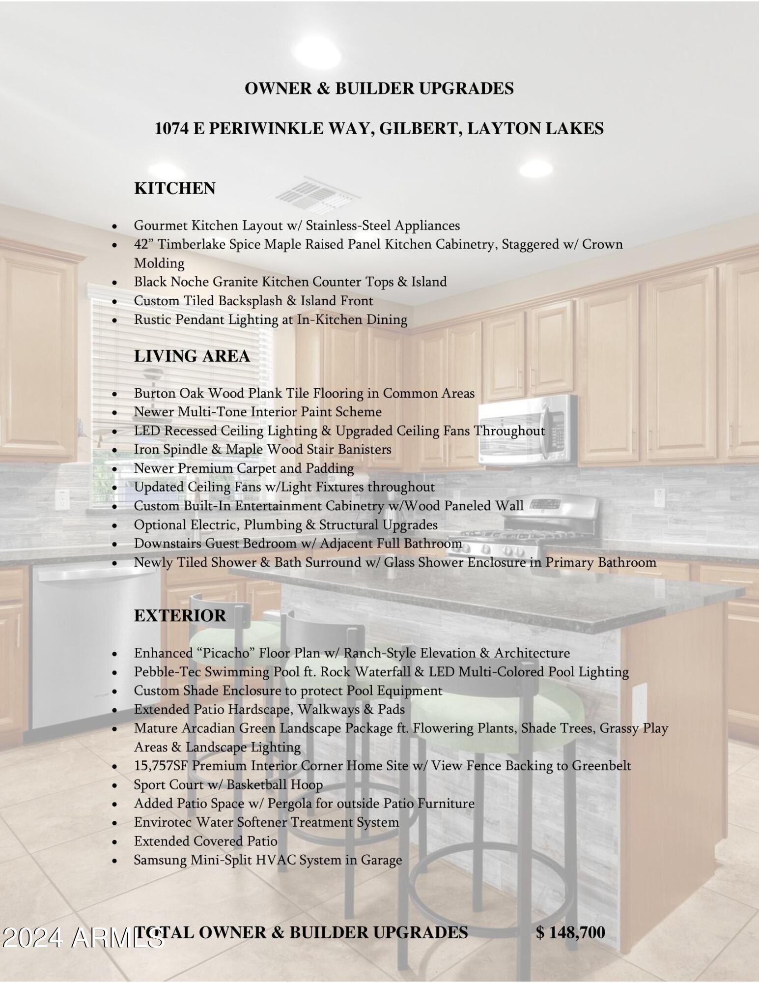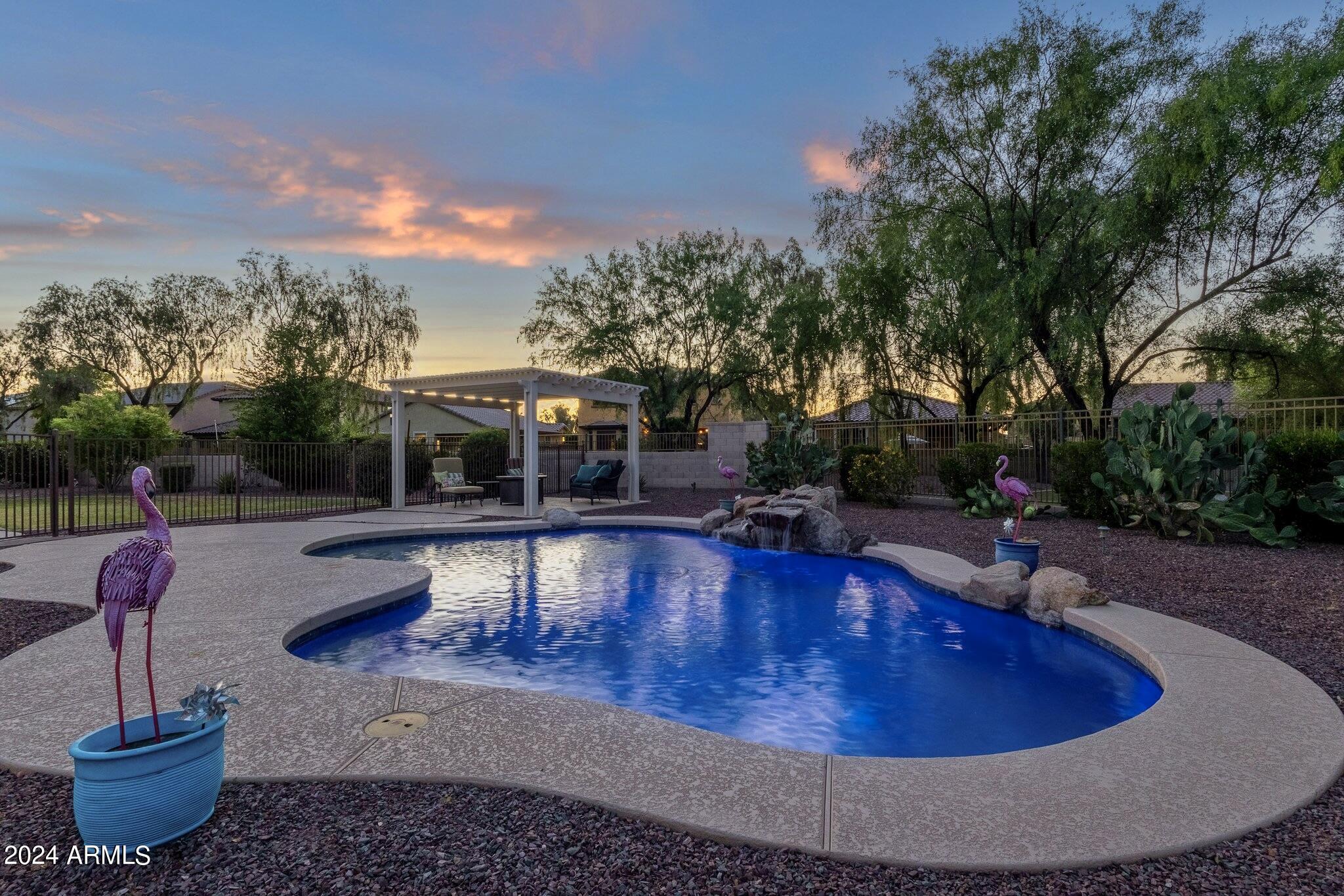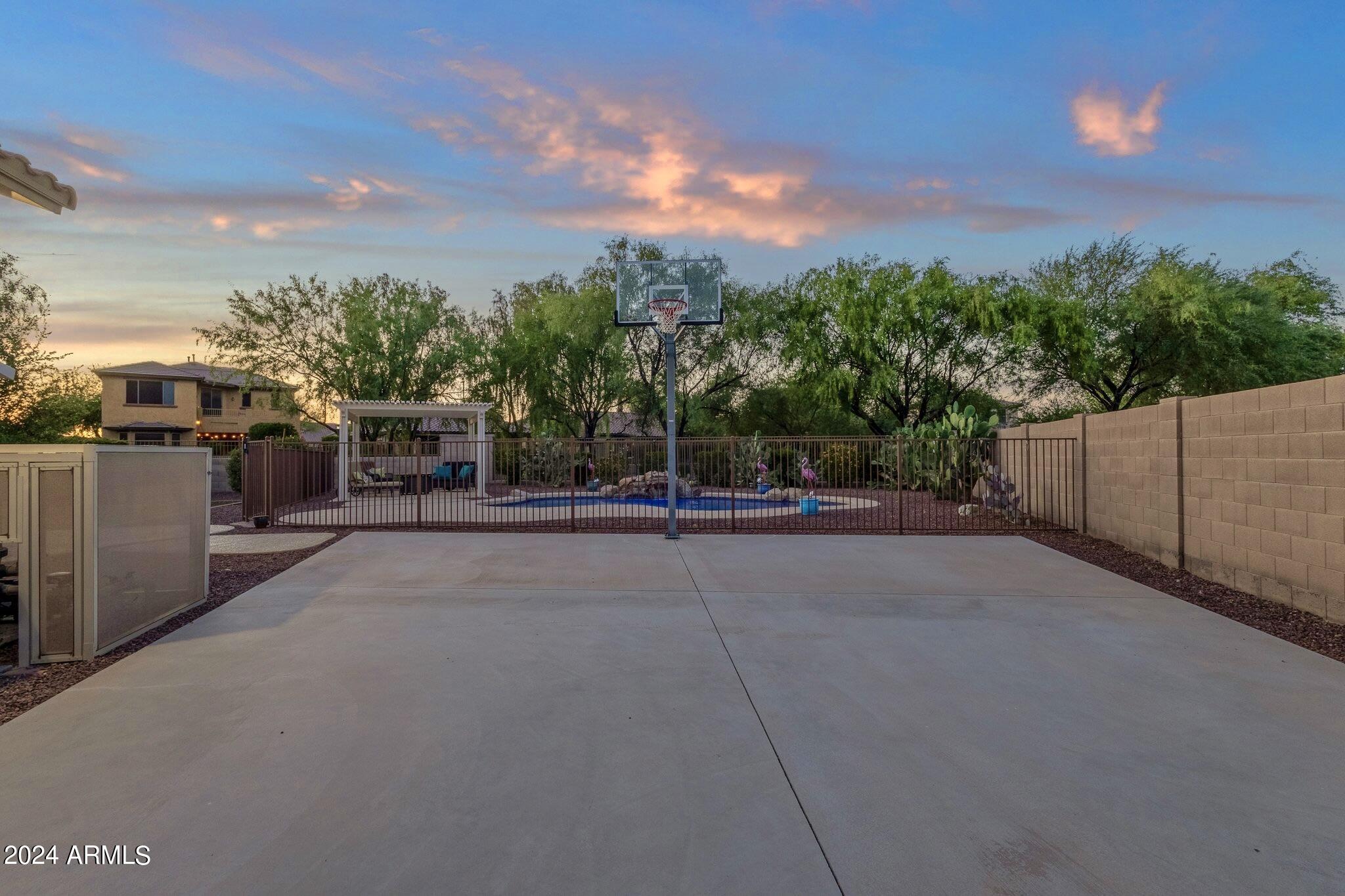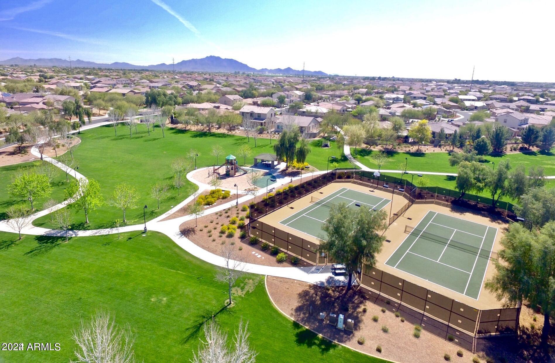 Rare Opportunity to Live in South Gilbert's Destination Master Plan Community of Layton Lakes! This new market offering portrays picture perfect living in every way. Imagine Living in this Lovely Ranch Inspired Family Home Displaying Craftsmanship, Designer Home Interior with Luxury Finishes & Countless Upgrades, Today's Open Floor Plan w/ expansive Home Spaces & Generous Owner's suite w/Spa-Style Bath. Fully Landscaped Premium Interior Lot over 1/3 acre that borders a Beautiful Greenbelt. Enjoy the summer days & nights in your outdoor escape featuring Mature Arcadian Green Landscape w/Flowering Plants & Trees, Sparkling PebbleTec Swimming Pool, Sports Court, Large Grassy Play Areas & expanded patio space w/ Pergola perfect for outdoor furniture & fire pit. THIS IS THE ONE! For more than a decade, Layton Lakes has been the destination community known for its picturesque scenery and neighborhood charm. It's warm and inviting, full of friendly neighbors, engaging lifestyle, and exceptional educational opportunities. Featuring several tree-lined parks, playgrounds, tennis, basketball and volleyball courts, soccer and baseball fields, lakes, streams, waterfalls, and splash pad all surrounded by scenic water lined walking trails. Nestled between both the thriving City of Chandler & Town of Gilbert, residents take advantage of the countless nearby amenities including the 101 & San Tan 202 freeways, shopping, dining, entertainment, airports, hospitals, booming business corridors, and new Southeast Valley Developments.