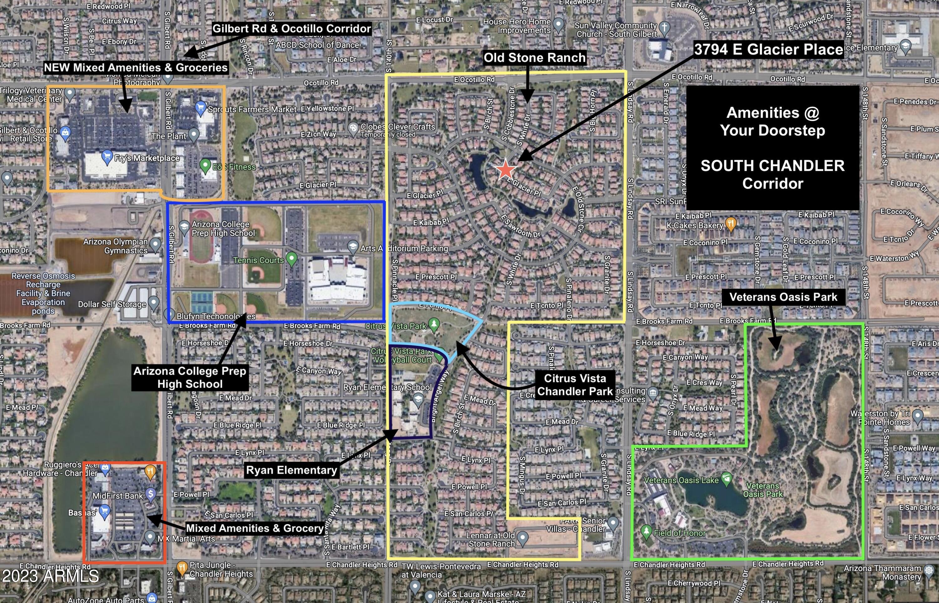 Old Stone Ranch has become a destination community known for its picturesque scenery and neighborhood charm. Its warm and inviting: full of friendly neighbors, engaging lifestyle and exceptional educational opportunities. Featuring Lakes, Streams, Fountains, Scenic Water Lined Walking Trails & Bridges, Multiple Parks & Children Play Areas, Covered Picnic Tables, White Picket Fences w/Elm Tree Lined Streets. Ryan Elementary and NEW ACP High School a short walk away within the community. Citrus Vista Chandler Park steps away & don't miss Veterans Oasis Nature Preserve & Lake Park.