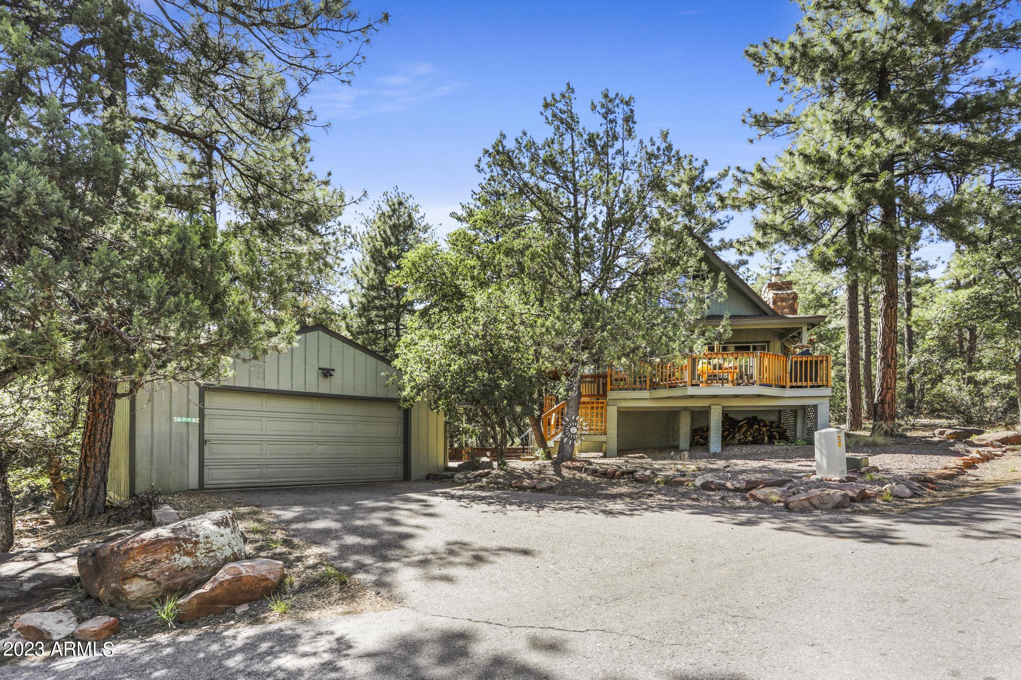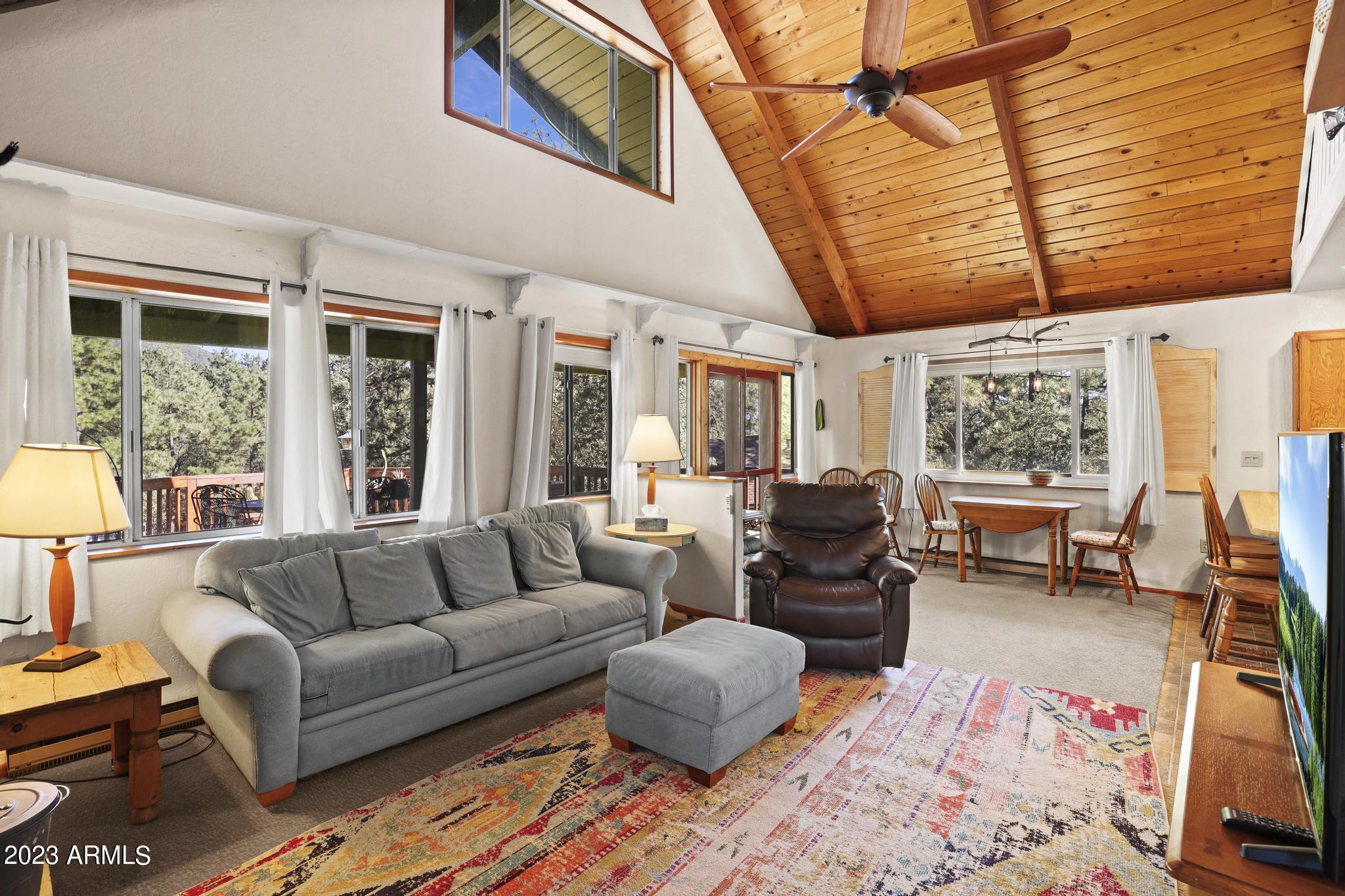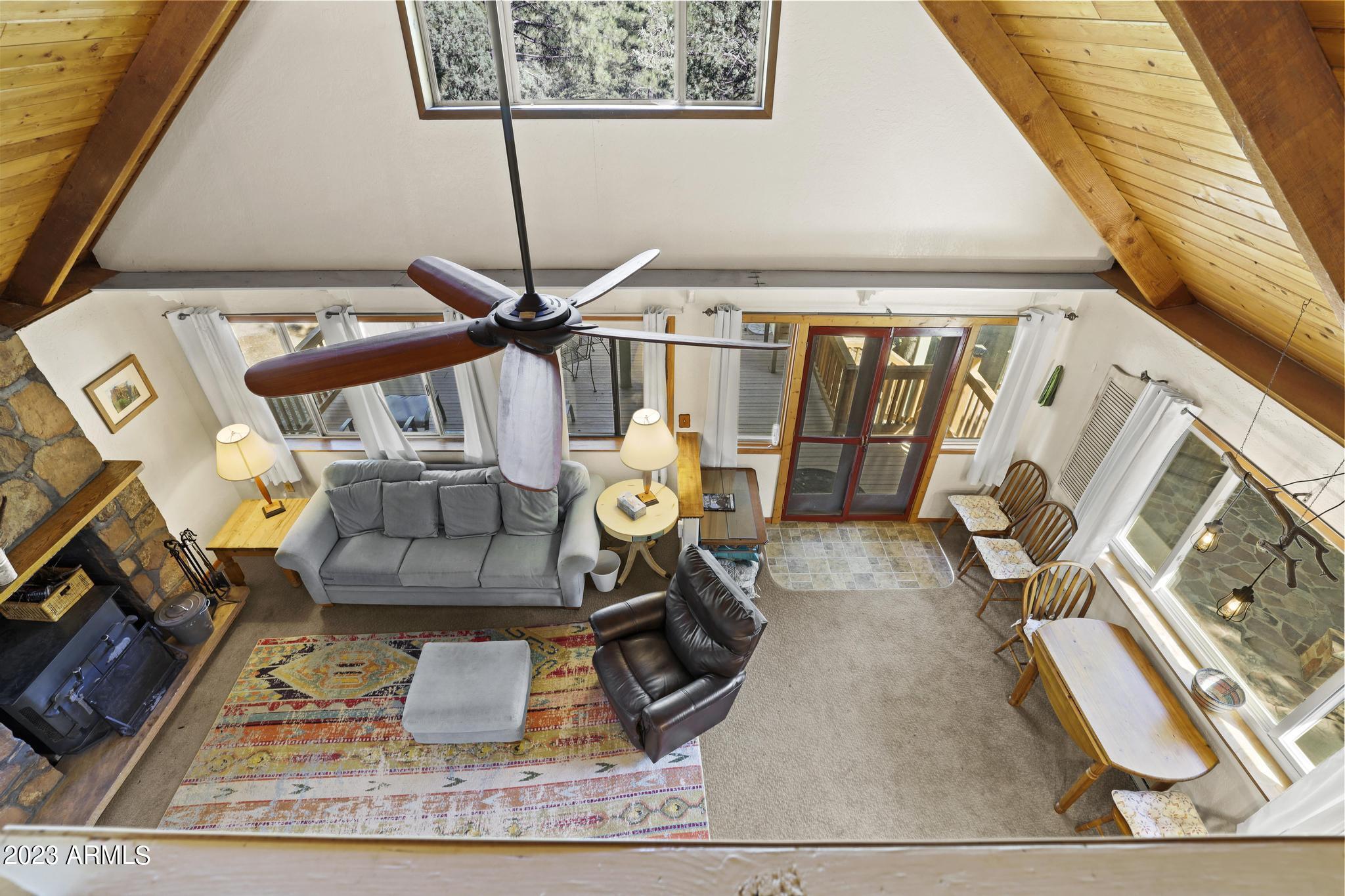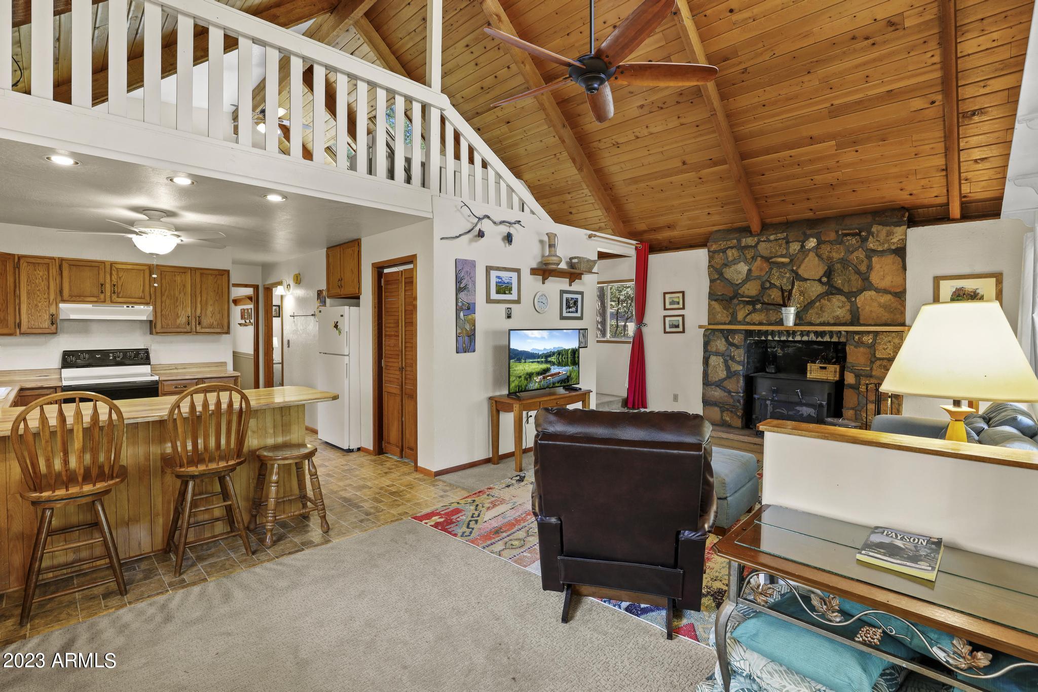 Welcoming A frame cabin with two large decks for enjoying cooler temps and starry nights. Open Floor Plan with soaring wood ceilings in main room which has large windows for views to the Rim and sunrise. Kitchen has breakfast bar, dishwasher, cooktop, walk-in pantry and is open to main spaces. Also on main level: bedroom, full bath and laundry room. Upstairs loft has a bedroom and half bath, outdoor deck and natural light. Spacious Two Car Garage.