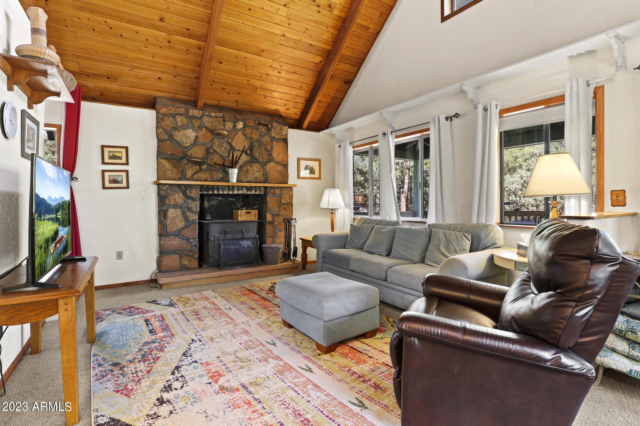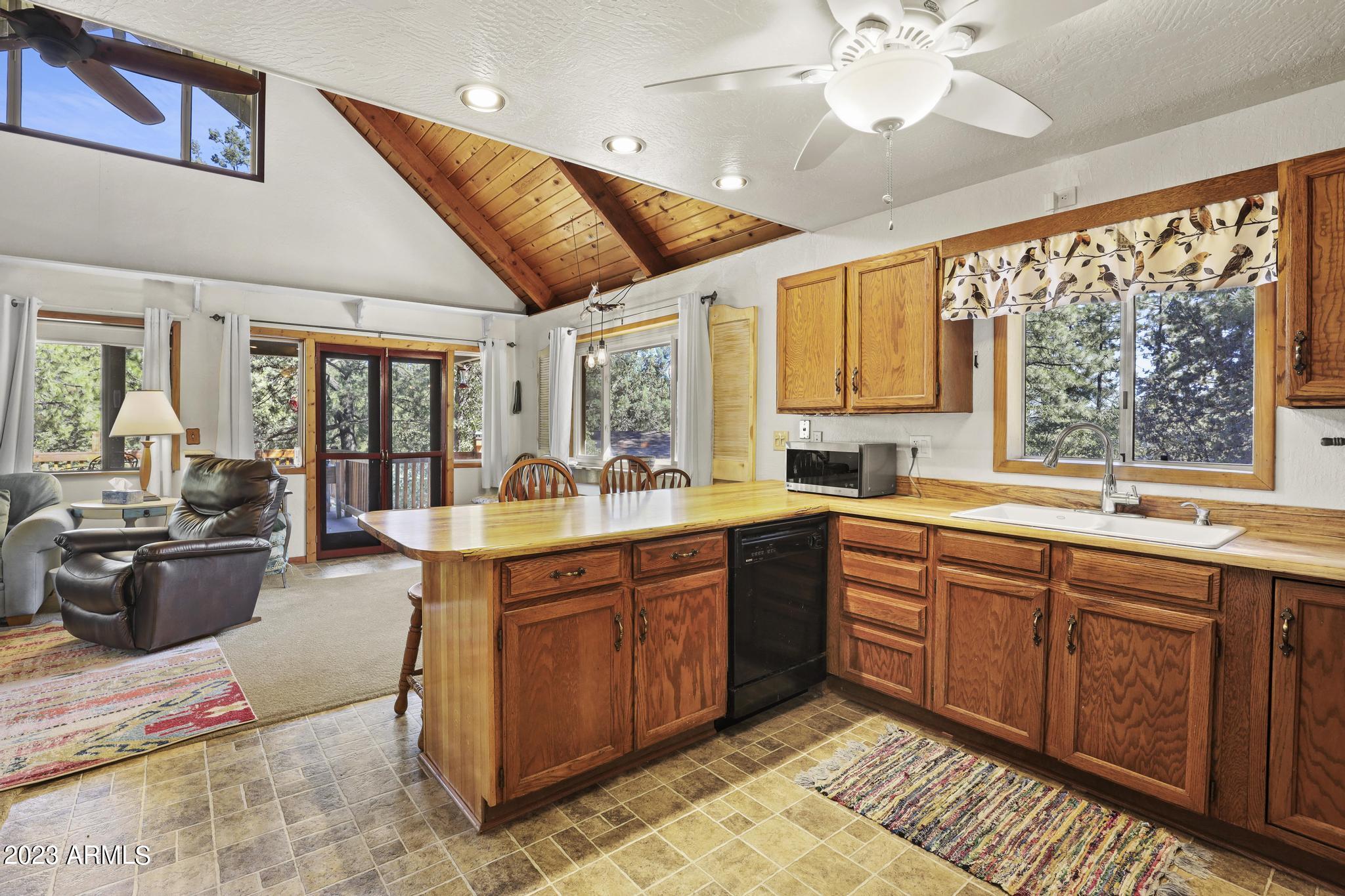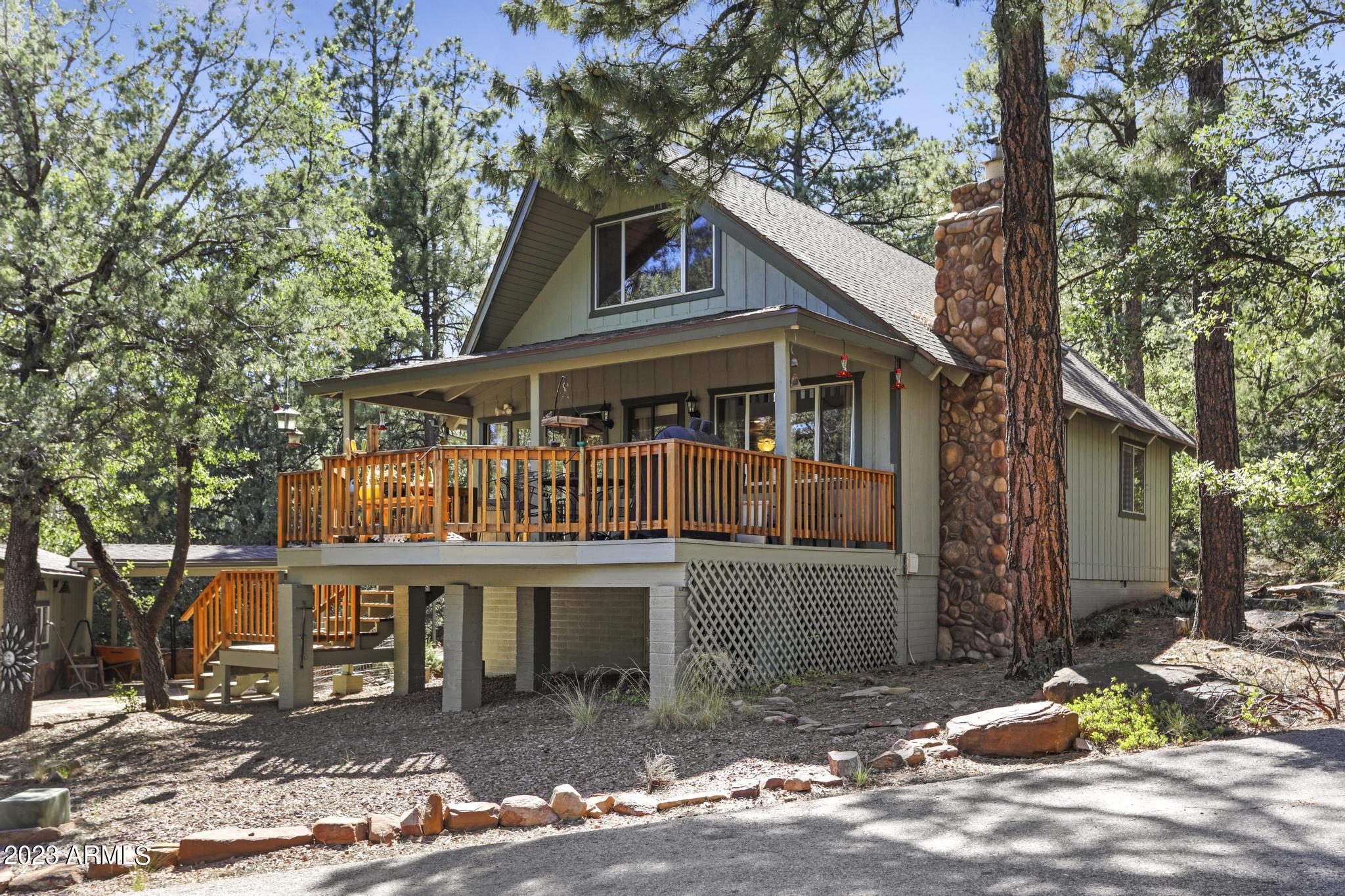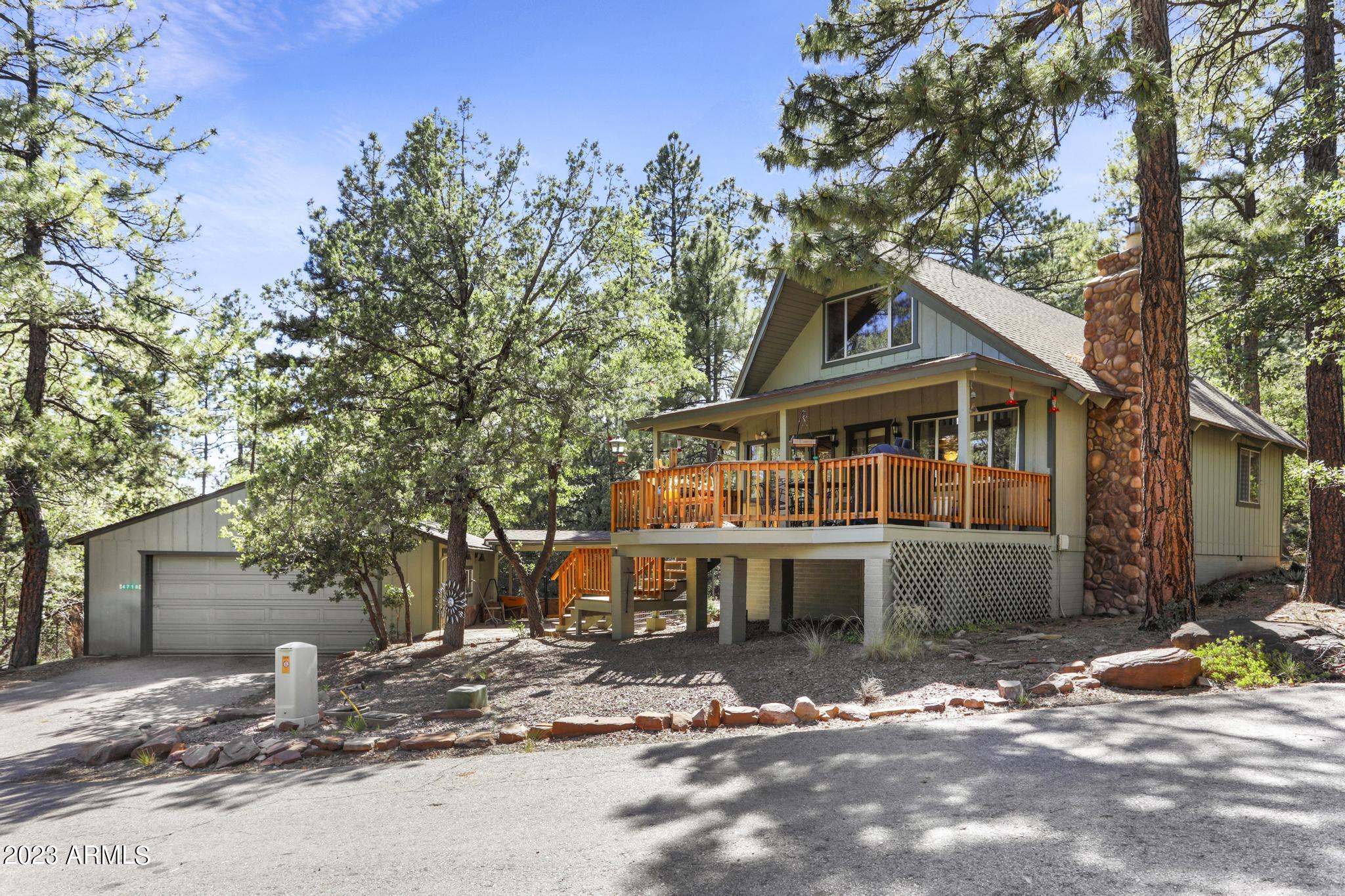 Welcoming A frame cabin with two large decks for enjoying cooler temps and starry nights. Open Floor Plan with soaring wood ceilings in main room which has large windows for views to the Rim and sunrise. Kitchen has breakfast bar, dishwasher, cooktop, walk-in pantry and is open to main spaces. Also on main level: bedroom, full bath and laundry room. Upstairs loft has a bedroom and half bath, outdoor deck and natural light. Spacious Two Car Garage.