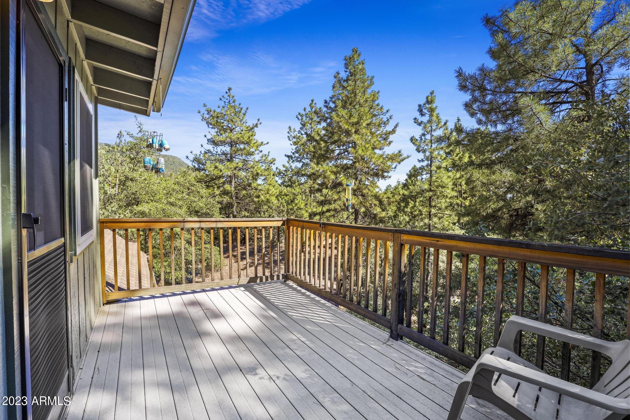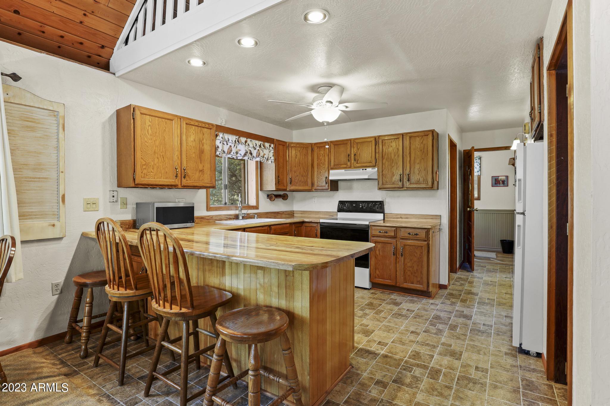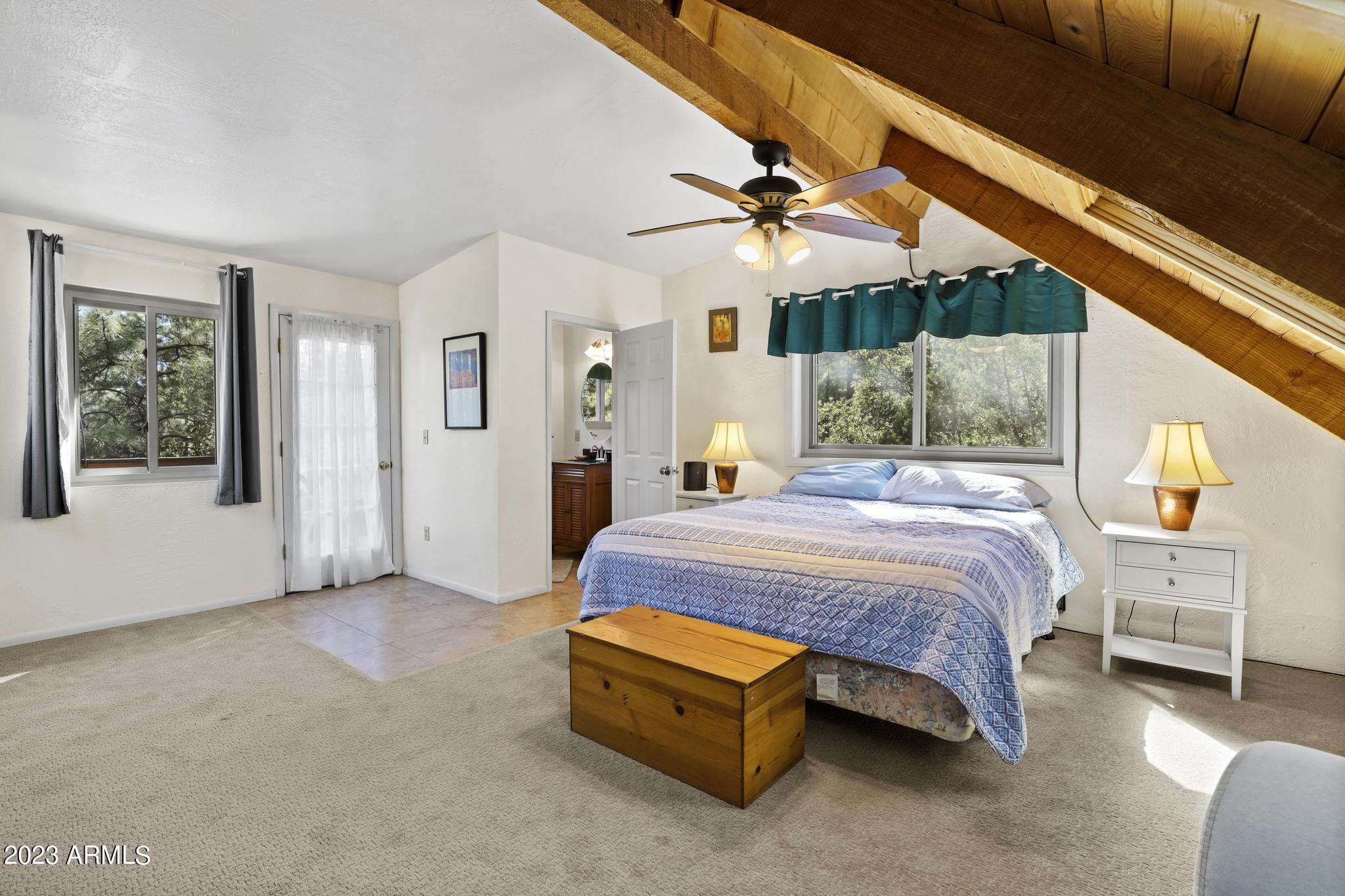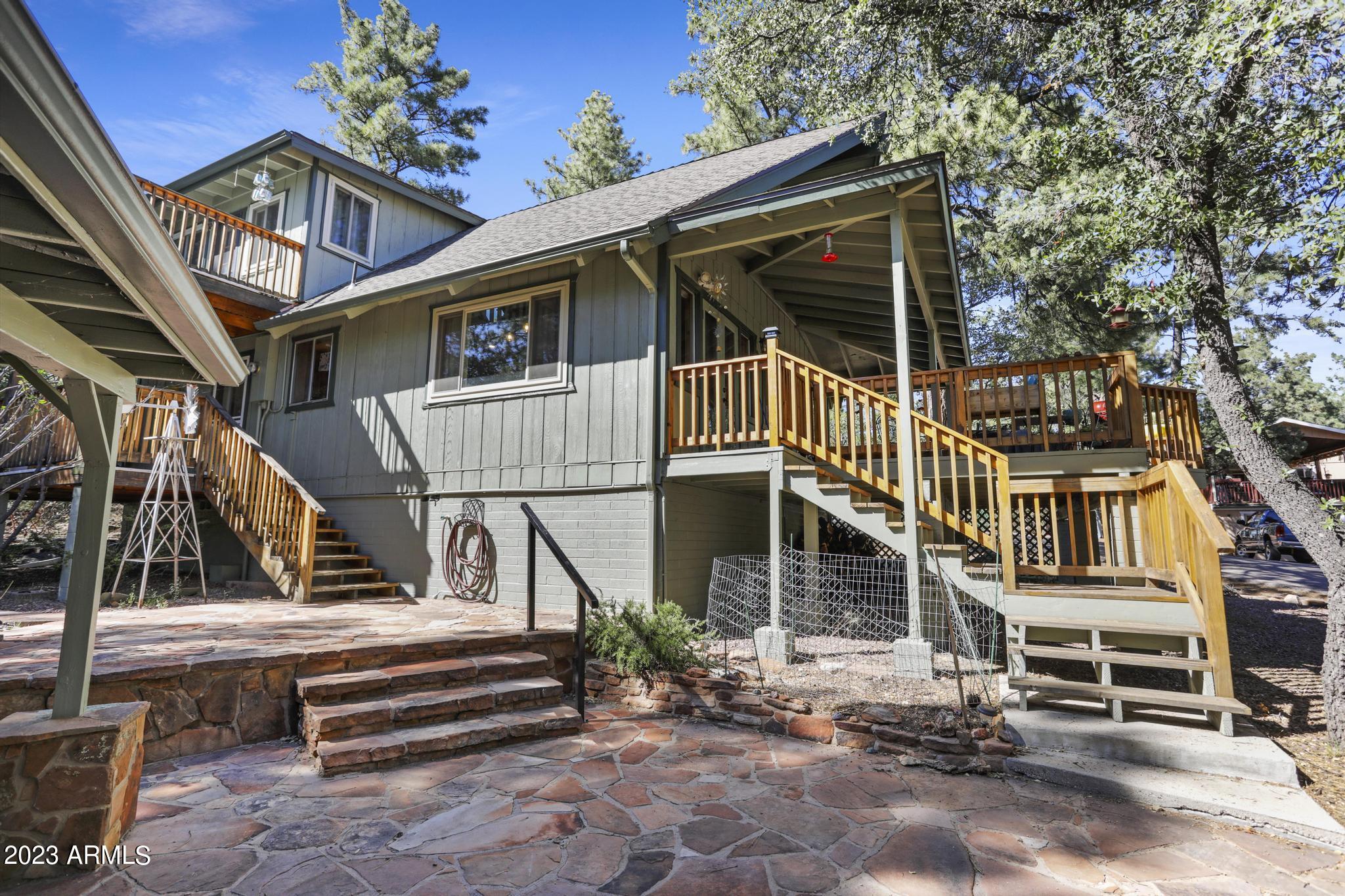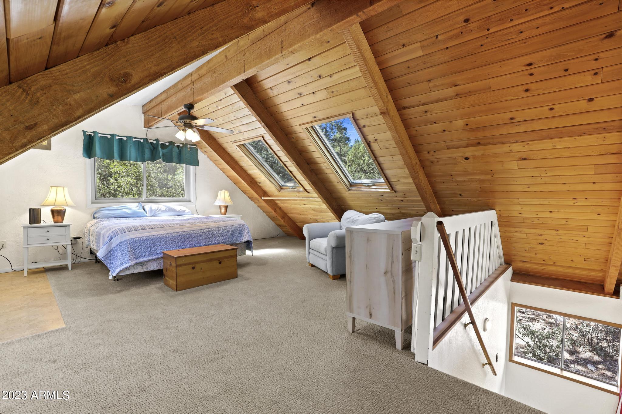Welcoming A frame cabin with two large decks for enjoying cooler temps and starry nights. Open Floor Plan with soaring wood ceilings in main room which has large windows for views to the Rim and sunrise. Kitchen has breakfast bar, dishwasher, cooktop, walk-in pantry and is open to main spaces. Also on main level: bedroom, full bath and laundry room. Upstairs loft has a bedroom and half bath, outdoor deck and natural light. Spacious Two Car Garage.