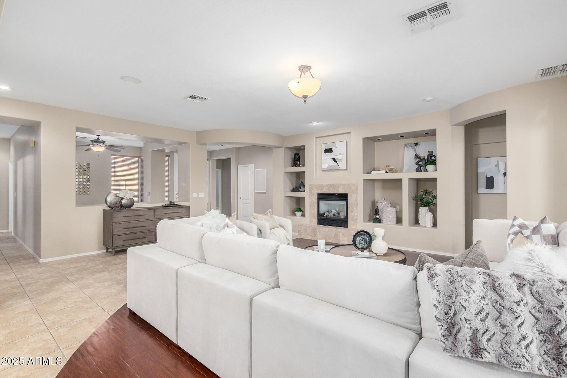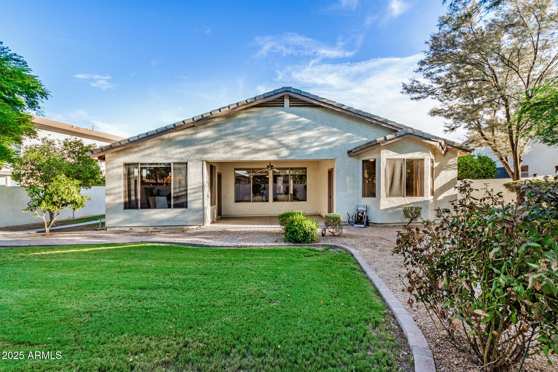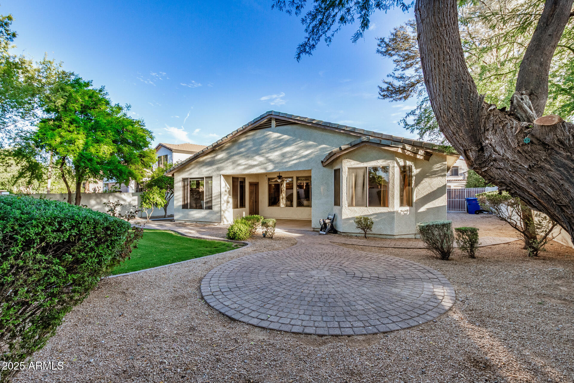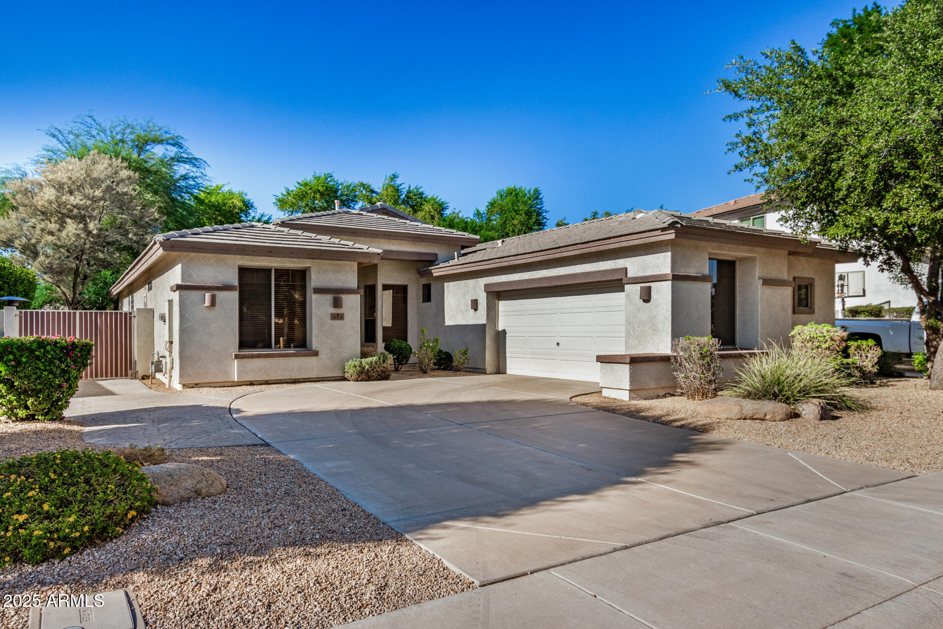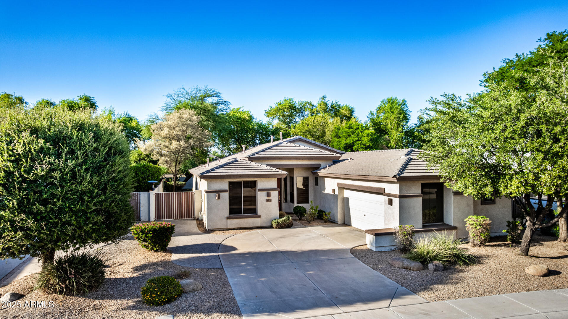 Explore Paseo Crossing and discover a 4-bedroom gem! A 2-car garage welcomes you, while a semi-open den invites cozy lounging. Great room is perfect for entertaining, complete with pre-wired surround sound, a gas fireplace, and stylish wall niches. Enjoy meals in the formal dining area or whip up culinary creations in a kitchen boasting Stainless Steel appliances, abundant cabinetry, a spacious pantry, granite counters, and a center island with a breakfast bar. Main bedroom is a serene retreat with direct backyard access, a private bathroom with dual vanities, a soaking tub, and a walk-in closet. Outside, the covered patio and generous backyard with plenty of space to design a pool oasis with sizzling BBQ. This gem isn't just a place to live, it's where memories are made! Welcome home!