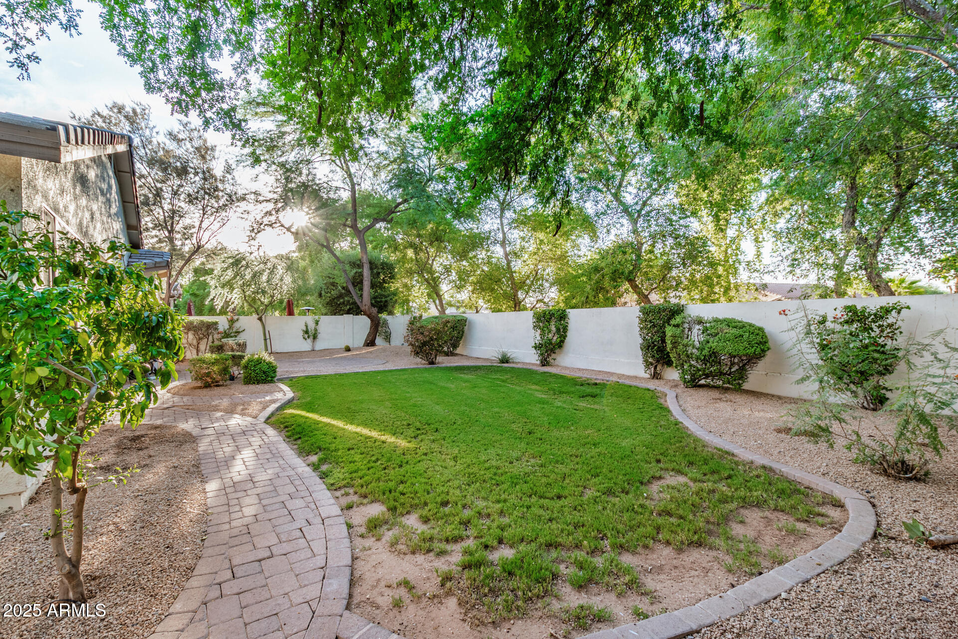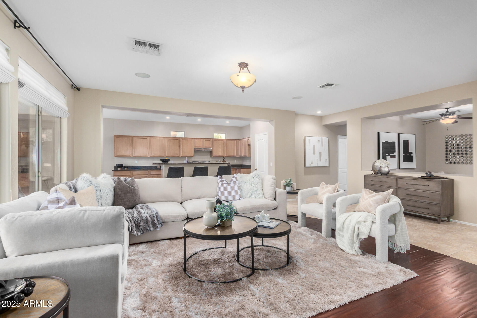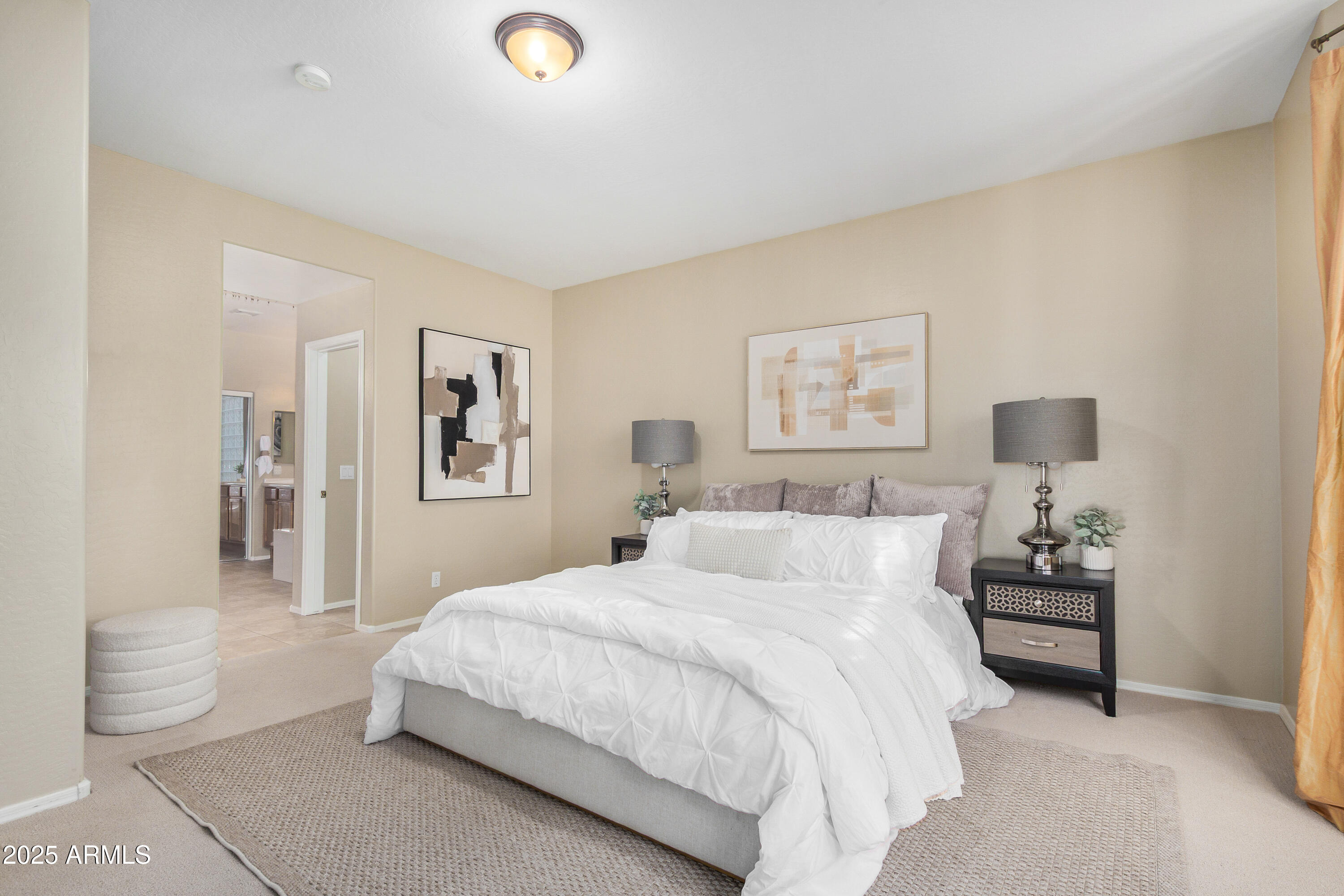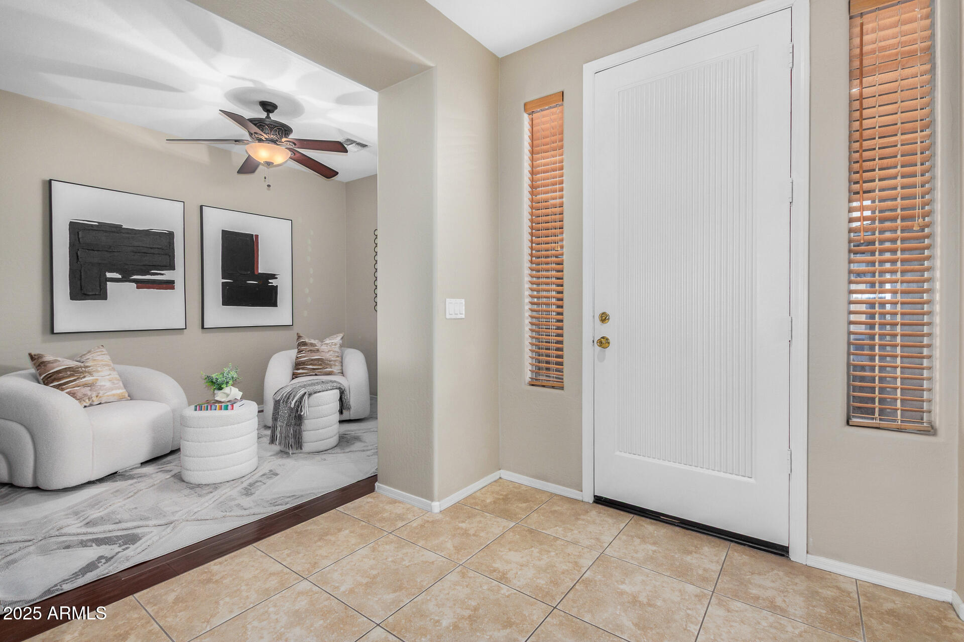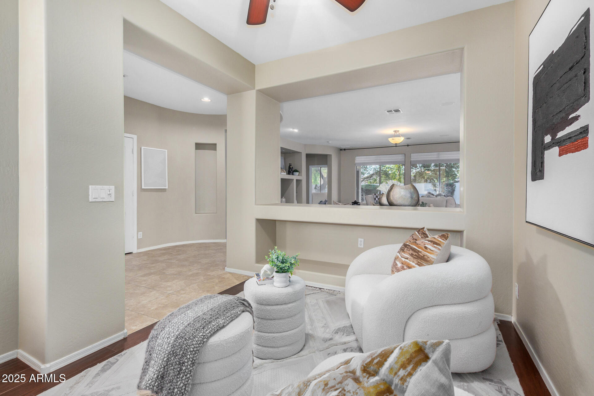 Explore Paseo Crossing and discover a 4-bedroom gem! A 2-car garage welcomes you, while a semi-open den invites cozy lounging. Great room is perfect for entertaining, complete with pre-wired surround sound, a gas fireplace, and stylish wall niches. Enjoy meals in the formal dining area or whip up culinary creations in a kitchen boasting Stainless Steel appliances, abundant cabinetry, a spacious pantry, granite counters, and a center island with a breakfast bar. Main bedroom is a serene retreat with direct backyard access, a private bathroom with dual vanities, a soaking tub, and a walk-in closet. Outside, the covered patio and generous backyard with plenty of space to design a pool oasis with sizzling BBQ. This gem isn't just a place to live, it's where memories are made! Welcome home!